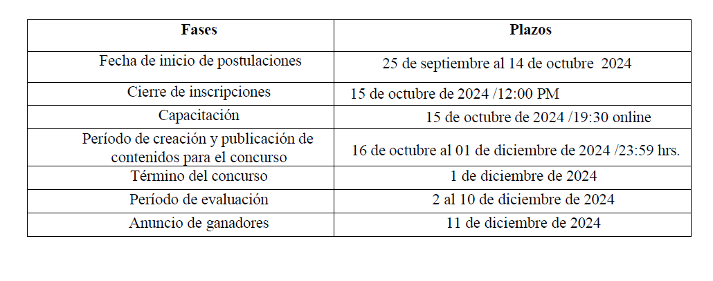 Agregó que los premios asignados a los mejores proyectos serán de $1.000.000 para el primer lugar, $600.000 para el segundo y $400.000 para el tercero. La participación es gratuita y está abierta a cualquier persona mayor de 18 años que sea estudiante regular de una de las universidades participantes y cuente con cuentas activas en las mencionadas redes sociales.