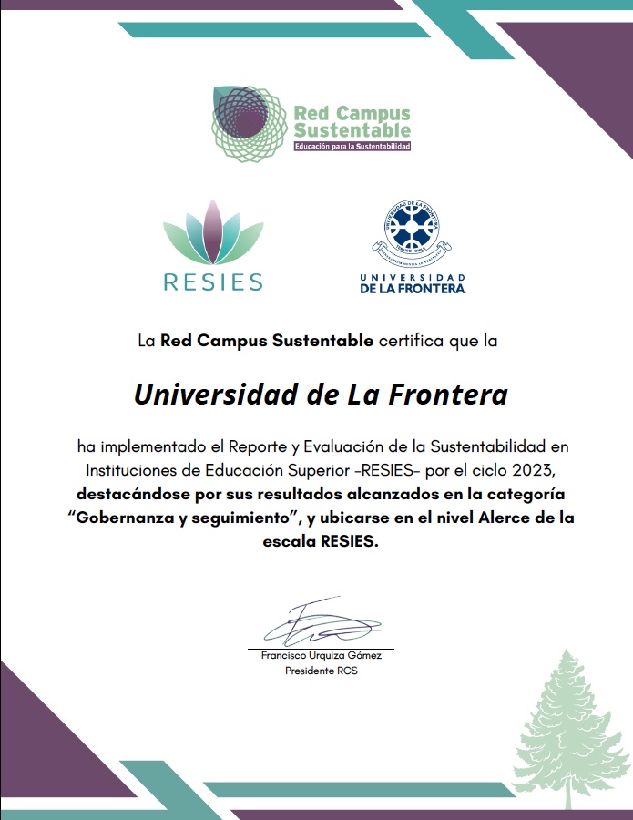 La Universidad de La Frontera fue reconocida en el ciclo 2023 por su desempeño en la categoría de Gobernanza y Seguimiento en RESIES, alcanzando el nivel Alerce y demostrando el compromiso institucional y directivo con la sustentabilidad.